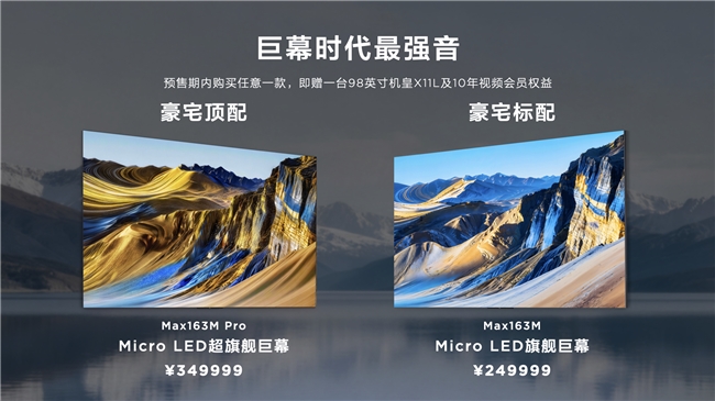 在普及SQD-Mini LED的同时,TCL还带来巨幕时代的最强音——163吋Micro LED旗舰巨幕双曜登场。豪宅顶配的Max163M Pro与豪宅标配的Max163M,均搭载2488万多颗无机自发光芯片,实现真4K实像素,其中Max163M Pro峰值亮度直达XDR 10000+nits。从2024年百万元级到如今Max163M定价249999元,TCL正将Micro LED从遥不可及的收藏品变为豪宅首选,让超沉浸式的巅峰画质体验进入更多家庭。