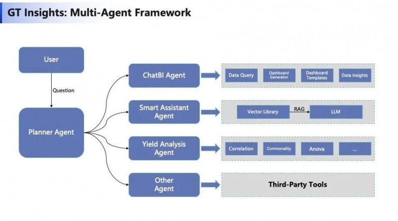 GT Insights的价值不止于单点能力的突破,更在于其作为格创东智CIM AI Foundation的重要组成部分,与它基于格创东智的Octopus AI Agent平台3.0开发,可通过AI Agent框架,与Planner Agent、Yield Analysis Agent等智能体“数字员工”协同工作。从被动响应走向主动规划分析路径、调用第三方工具(如SPC软件、良率分析插件),形成闭环的分析决策能力。