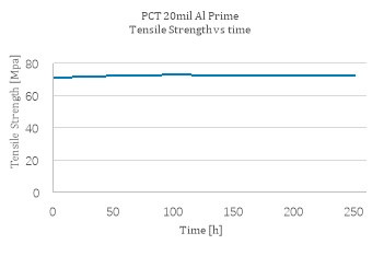 测试结果显示20mil Al Prime铝线在经过PCT250小时后,抗拉强度没有出现明显衰减的迹象,说明该型号铝线具有出色的抗水汽腐蚀的能力。