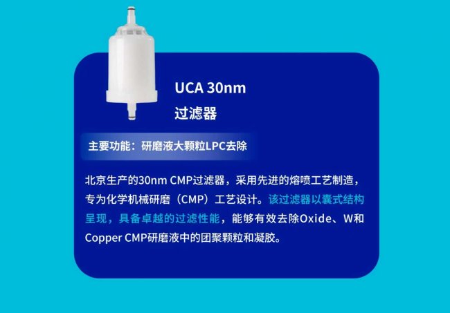 专为CMP场景设计的UCA 30nm过滤器采用熔喷工艺制造,精准去除Oxide、W和Copper CMP研磨液中的团聚颗粒与凝胶。这款产品的意义不仅在于提升研磨液纯度,更在于帮助客户将工艺缺陷率压降至可控水平,让先进制程中的晶圆平坦化工艺拥有更稳定的工作基础。