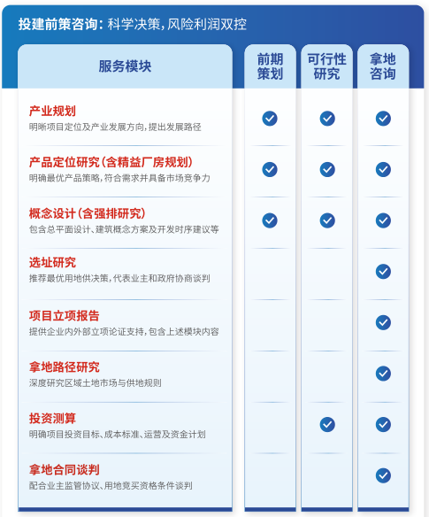 投建前策咨询:服务涵盖前期策划、可行性研究与拿地咨询,为项目投资提供科学决策依据。基于市场、政策及经济可行性,定制最优方案,确保项目定位精准、风险可控、成本可控。同时,提供土地投资决策服务,保障最优开发条件,前置排查潜在开发风险。