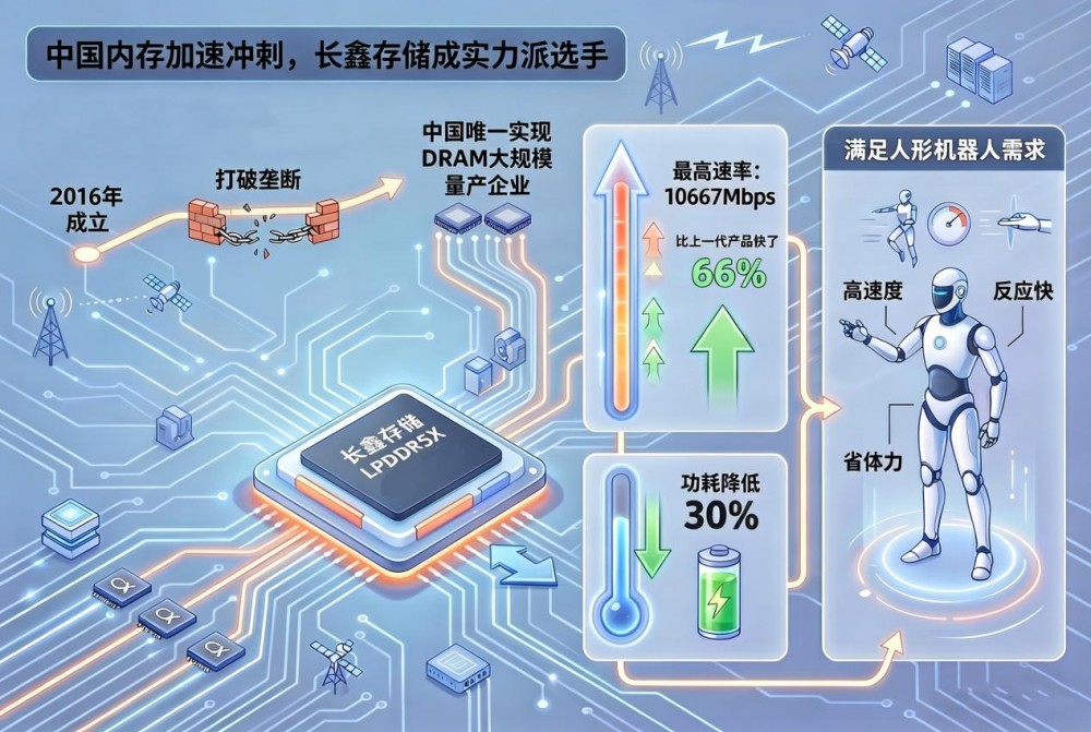 目前,长鑫存储的LPDDR5X内存,最高速率达到10667Mbps,远超由JEDEC定义的标准速率,跻身国际领先水平,比上一代产品快了66%,功耗还降低了30%。正是这样的高性能,才能满足人形机器人对“速度快、反应快、省体力”的需求。