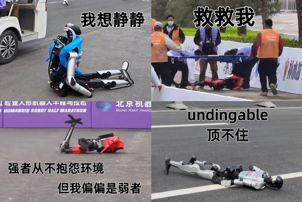 这次半马赛道既有平坦的主干道,也有蜿蜒小道,10余种地形和近20个弯道,不少机器人没能“扛住考验”,有的迈着小碎步跑偏方向;有的没稳住重心摔倒;还有的干脆“摆烂”,原地宕机。