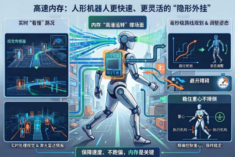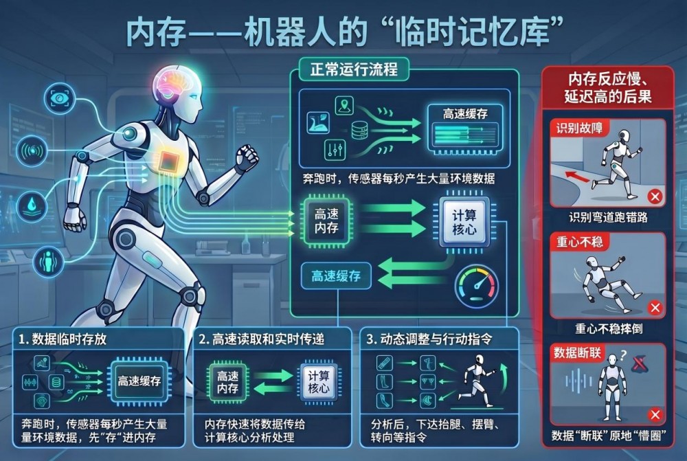 对人形机器人来说,内存就像“临时记忆库”,管着数据的临时存放、高速读取和实时传递,堪比“数字海马体”。机器人奔跑时,传感器每秒都会产生大量环境数据,这些数据得先“存”进内存,再快速传给计算核心分析处理,紧接着才能下达抬腿、摆臂、转向等指令。要是内存反应慢、延迟高,数据传输就会“卡壳”,要么没识别弯道跑错路;要么没稳住重心摔倒;更可能因数据“断联”而原地“懵圈”。