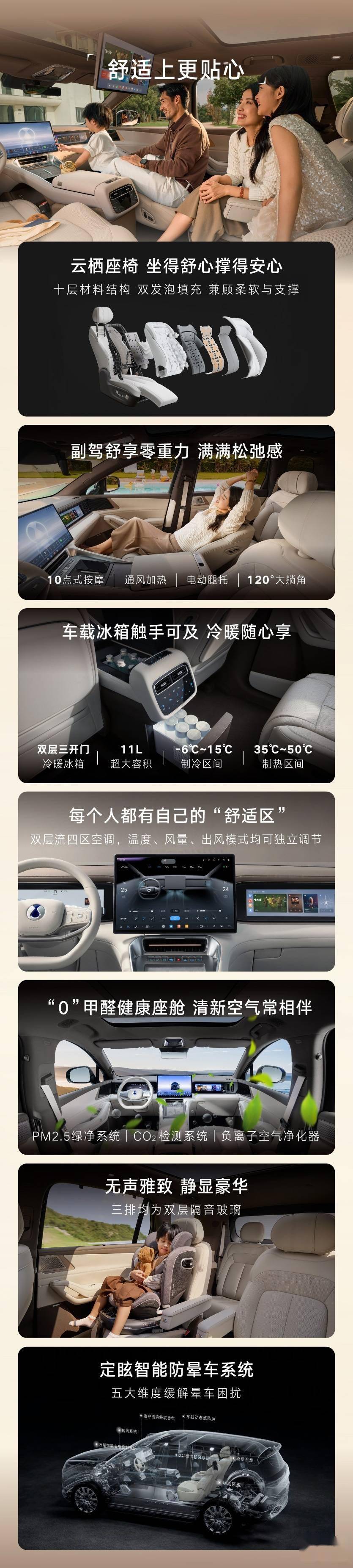 内饰配置方面,腾势N8L以“冰箱彩电大沙发”为亮点,配备双幅方向盘、49处收纳空间及双50W手机风冷无线快充。后排搭载17.3英寸吸顶屏,支持DeepSeek AI大模型交互。座椅方面,副驾与第二排采用十点按摩零重力座椅,第三排支持靠背调节与10cm前后滑动,并配备独立空调出风口、帝瓦雷音响及三挡可调座椅加热。智能钥匙方面,车辆支持手机UWB车钥匙、双侧手机NFC车钥匙,以及HiCar、Carlink、荣耀车联等多平台互联。