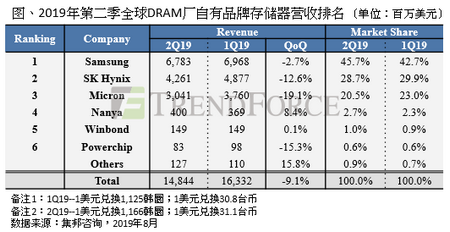 观察各厂营收表现,三星依然稳坐DRAM产业的龙头,因为第一季发生的1Xnm服务器产品问题已逐渐淡化,使得三星第二季的销售位元出货量明显成长,季增略高于15%,不过受到报价下跌超过两成的影响,季营收仍衰退2.7%,达67.8亿美元。市占率部分,受服务器领域出货量回升带动,从上季的42.7%成长3%,来到45.7%。