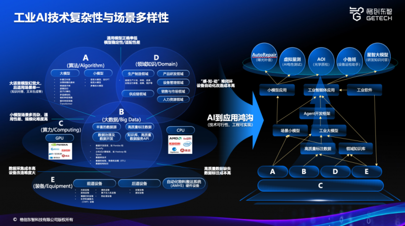 杨丽指出,工业AI落地需跨越数据、模型、成本、工程等多重挑战。为此,格创东智提出“ABCDE”工业AI实施框架,贯穿Algorithm(算法)、Big Data(大数据)、Computing(算力)、Domain(领域知识)、Equipment(装备)五大维度,系统化推进AI技术在复杂工业场景中的落地闭环。杨丽强调,具备工业细分行业的领域知识和装备经验的企业,去融合数据、算法、算力能力,才能把工业智能落到实处,满足先进制造业在稳定性、准确性方面的极致需求。