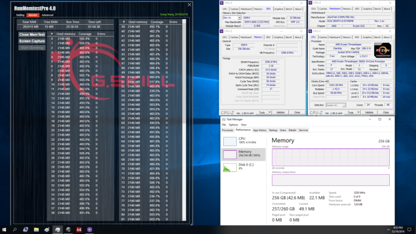 广受好评的焰光戟是许多AMD平台玩家的内存优先选择,芝奇为提供第三代AMD Ryzen Threadripper高端玩家拥有更快、更大容量的顶级规格,全新推出焰光戟 DDR4-3200 CL14-18-18-38 256GB (32GBx8) 豪华内存套装,经由严密的测试来确保其拥有强大的超频潜力以及稳定的兼容性。下图为此规格在AMD Ryzen Threadripper 3960X 处理器及 ASUS ROG ZENITH II EXTREME 主板上通过烧机测试的截图画面: