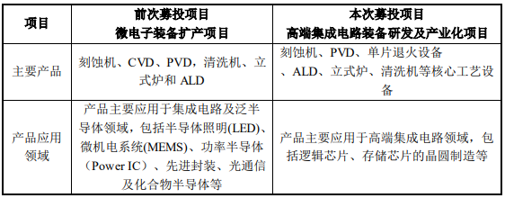 这次非公开募投项目“高端集成电路装备研发及产业化项目”和前次重组募投项目“微电子装备扩产项目”涉及产品的种类和应用领域的差异如下所示: